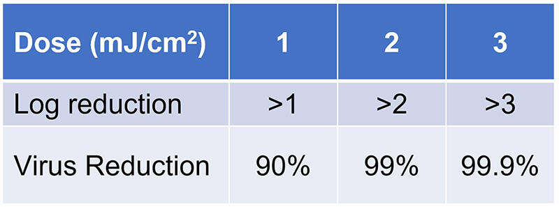 Il suffit de 0,56 mJ/cm2 pour inactiver 90 % des coronavirus humains.